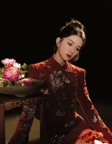 周也轻抚红色纱裙,姿态优雅如古典画卷,眼中闪烁着对新年的无限憧憬