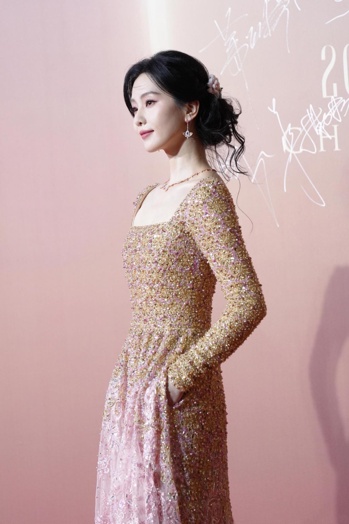 值得一提的是,这组照片的魅力很大程度上源于其“生图”属性。没有影棚里完美的灯光布景,也没有后期过度的肌肤磨皮,图片中皮肤的质感、礼服面料的光泽乃至现场的光影都显得无比真实。这种真实感非但没有折损她的美丽,反而让那份优雅变得更加可触可感。脸颊旁自然散落的几缕发丝,为整体端庄的造型注入了一丝随性与温柔,让人联想到她此前穿裸粉色礼裙时那种“大家闺秀温婉动人”的神韵。